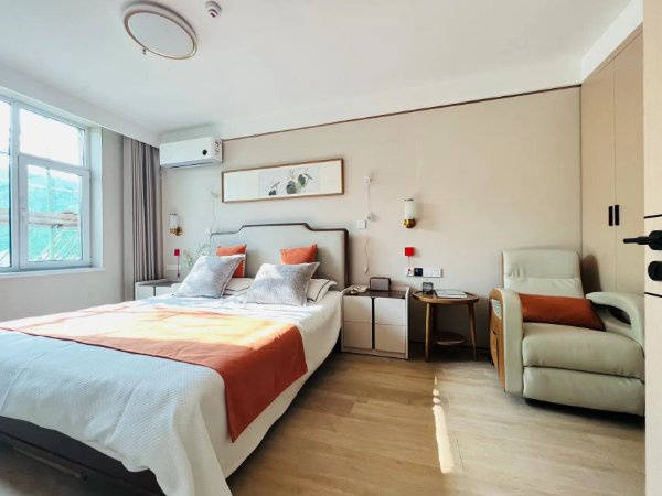 总占地面积46800平方米,建筑面积约26000平米,整体规划科学合理,设置标间、套间等各类房型共400余间(套)。房间内部配套完善,独立卫生间、24小时热水供应、液晶彩电、简易小厨房及全套厨具、冰箱、空调、洗衣机等生活必备设备一应俱全;同时配套衣柜、床头柜、适老床具、写字桌、沙发、古木茶几等家具,兼顾实用性与舒适性。纯净饮用水直接入户,宽带网络全面覆盖,冬季采用地暖供暖,居住体验舒适宜人。园区全域铺设防滑地板,走廊、浴室、恭桶旁均安装防护扶手,无障碍设施完备。此外,多功能厅、宴会厅、阅览室、书画室、台球室、麻将室、老年KTV、健身房等室内活动场所应有尽有;室外规划二十多亩垂钓园、采摘园及农家乐区域,绿化面积占比高达80%,为长者打造出自然惬意、宜居舒适的养老环境。